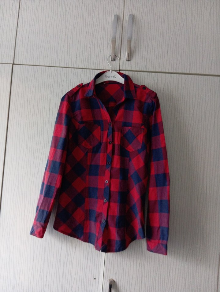 Koyu kırmızı ekose desenli, yakalı ve düğmeli kadın gömleği. Uzun kollu, salaş kesim, günlük kullanıma uygun rahat tekstil kumaş.