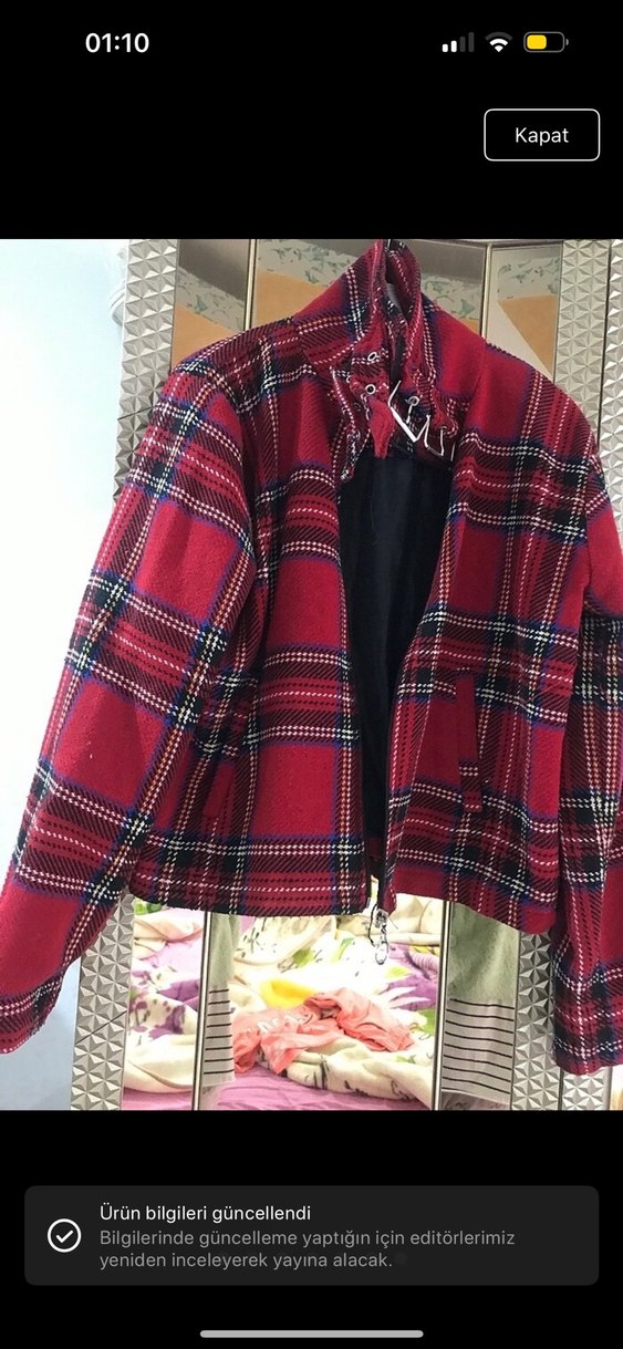 Kırmızı Ekose Desenli Kadın Midi Ceket
