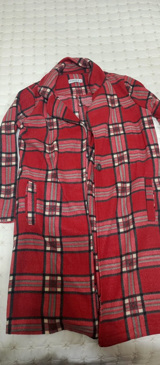 Kadınlar için düğmeli, uzun kollu ve kesik yaka detaylı kaban. Yumuşak ve sıcak kumaştan, kırmızı ekose desenli, bol kesim ve midi boyda. Rahat sokak stili için uygundur.