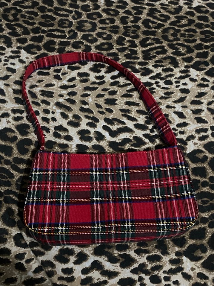 Kırmızı ekose desenli, tokalı ve sentetik kumaştan yapılmış kadın omuz çantası, Paris sokak modasına uygun.