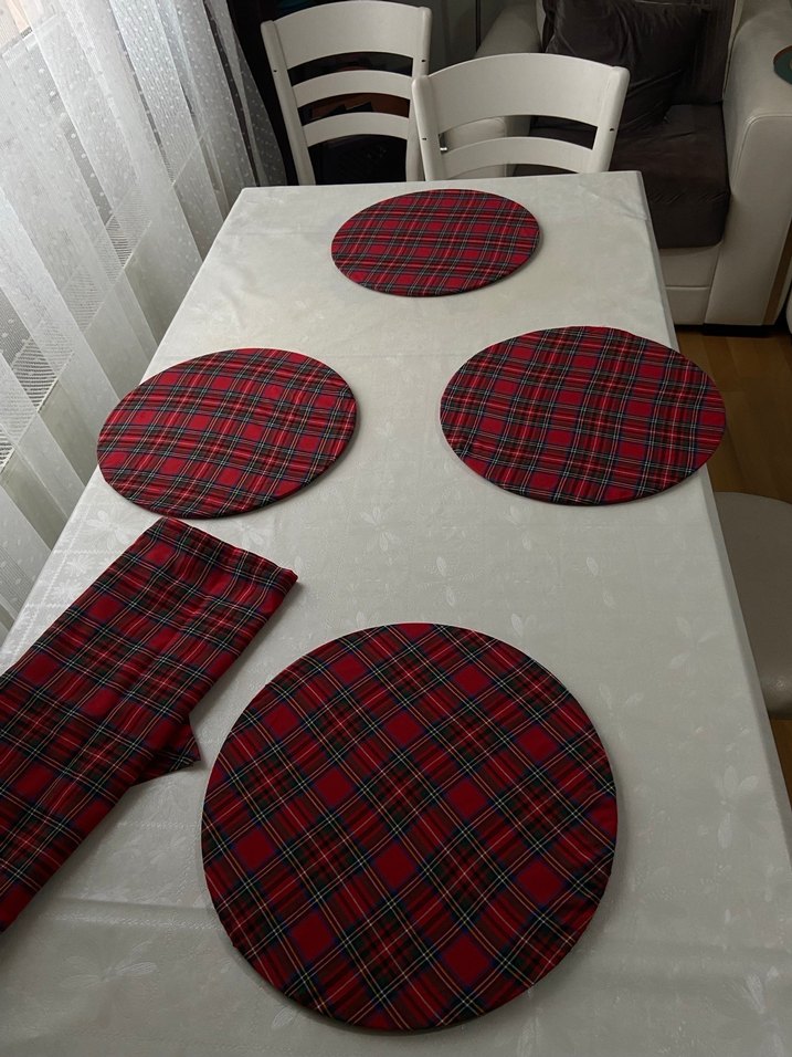 Koyu kırmızı renkte, geleneksel ekose desenli masa örtüsü, yemek alanınıza klasik bir dokunuş katıyor. ️ 4 adet supla tahtası 4 adet supla kılıfı 1 runner