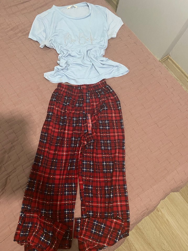 Rahat kesim kırmızı ekose desenli pijama altı, hafif kısa kollu üst ile kombinlenmiş. Rahat ve konforlu günlük stil