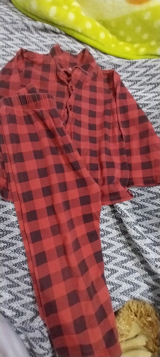 kırmızı ve siyah ekose desenli, uzun kollu, midi boy rahat kesim pijama takımı. Sokak stili ve konforlu tasarım sunar. 1-2yaş için uygun