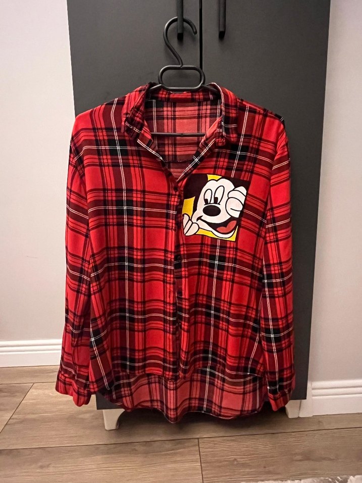 Kırmızı ekose desenli, uzun kollu, yakası kesimli ve düğmeli kadın gömleği. 38 beden