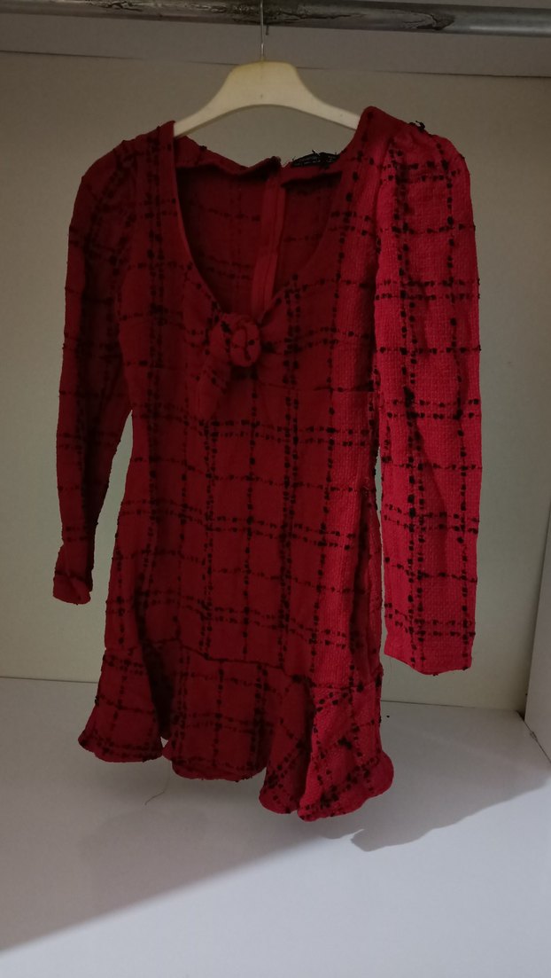 Kırmızı Ekose Desenli Uzun Kollu Kadın mini elbise