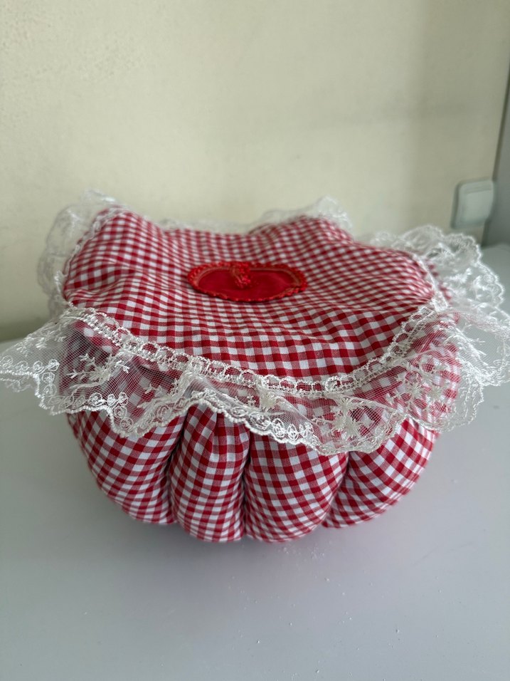 Renkli kırmızı ekose desene ve nakışlı detaylara sahip, dantel süslemeli yoğurt mayalama minderi