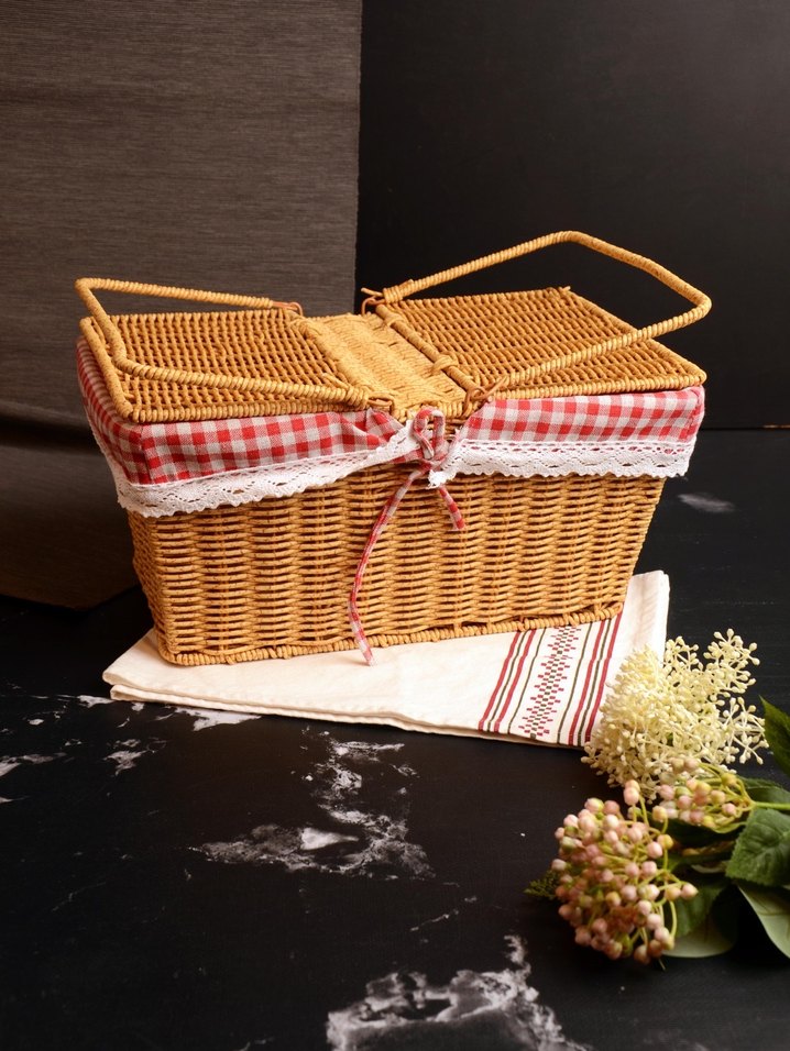Kırmızı Ekose Detaylı Rattan Sepet