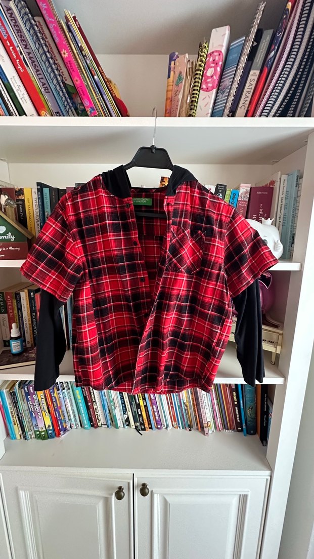 Penye uzun kollu, düğmeli ve yakalı, koyu kırmızı ekose desene sahip bol kesim erkek çocuk gömleği. Günlük kullanıma uygun rahat bir sokak stili.