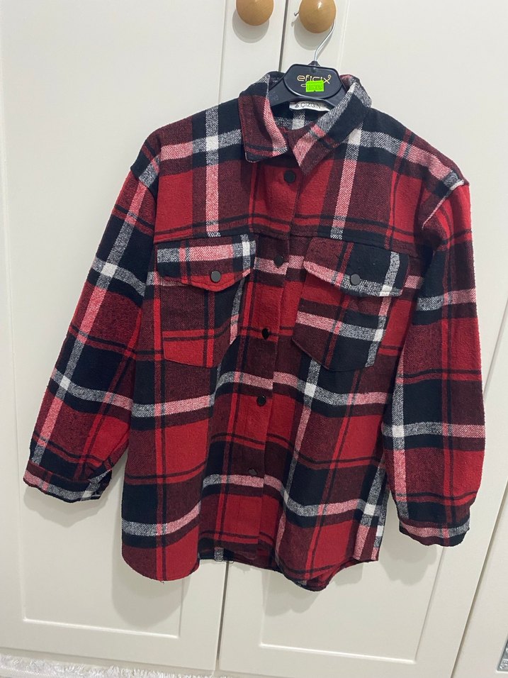 Kırmızı ekose desenli, düğmeli, kısa boylu, uzun kollu ve gevşek kesim kadın gömleği. Yumuşak ve sıcak kumaştan, rahat sokak stiline uygun.