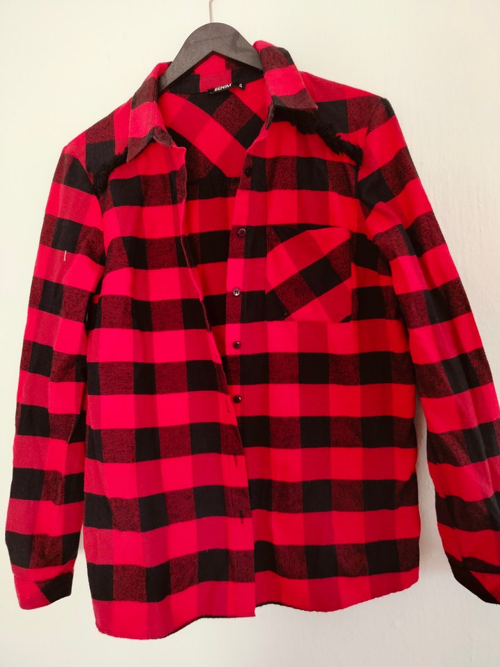 Kadınlar için düğmeli, uzun kollu, kırmızı ve siyah ekose desenli gömlek. Rahat kesimi ve yumuşak, sıcak kumaşıyla günlük kullanıma uygundur.