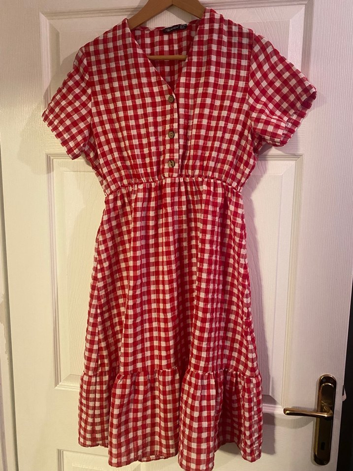 Renkli kırmızı ekose midi elbise, kısa kollu, V yakalı ve düğmeli detaylara sahip. Salaş kesimi ve vintage bohem tarzıyla dikkat çeker.