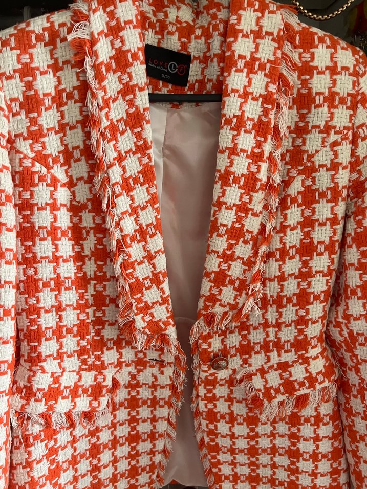 Kırmızı ekose desenli, düğmeli, normal ve midi boy, uzun kollu kadın blazer. Tekstil kumaştan, parlak görünümlü, günlük sokak stili için uygun.