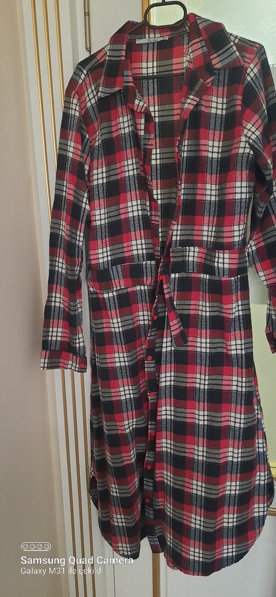 Kırmızı Ekose Düğmeli Uzun Kadın Gömlek