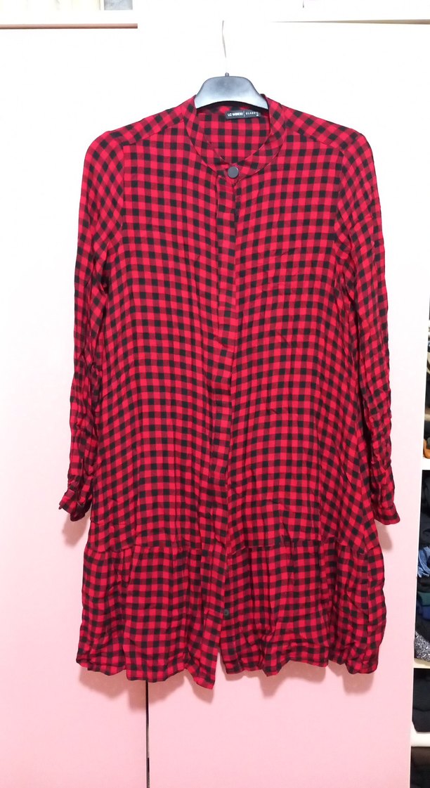 Kırmızı ekose desenli, uzun kollu, düğmeli, salaş kesim kadın gömleği. Midi boyda, yuvarlak yakalı, rahat ve renkli sokak tarzı.