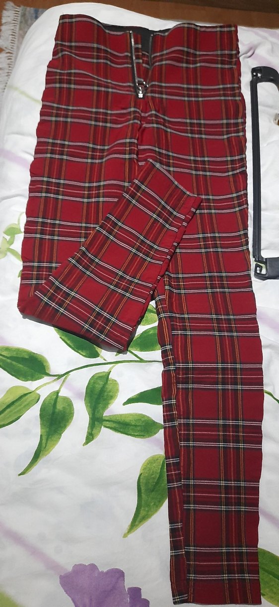 Kırmızı ekose desenli, fermuarlı, sentetik kumaştan yapılmış, dar kesim kadın pantolonu, rahat sokak stili için uygundur.