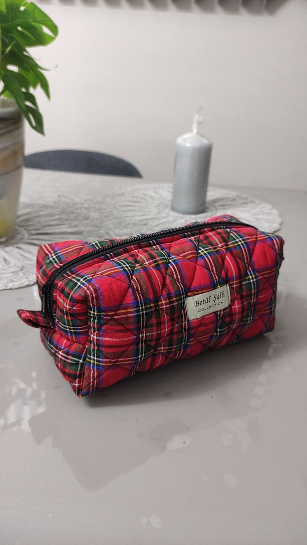 Kırmızı ekose desenli, yumuşak ve sıcak kumaştan fermuarlı makyaj çantası. Günlük kullanıma uygun, rahat ve karşı kültür tarzında.