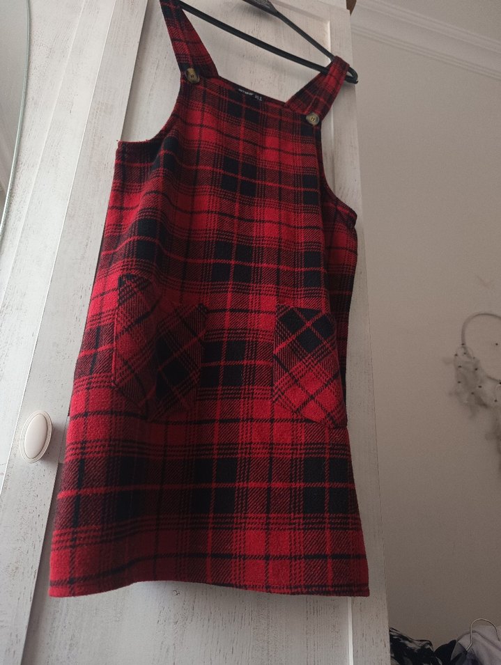 Koyu kırmızı ekose desenli, askılı ve ön cepli goth salopet.