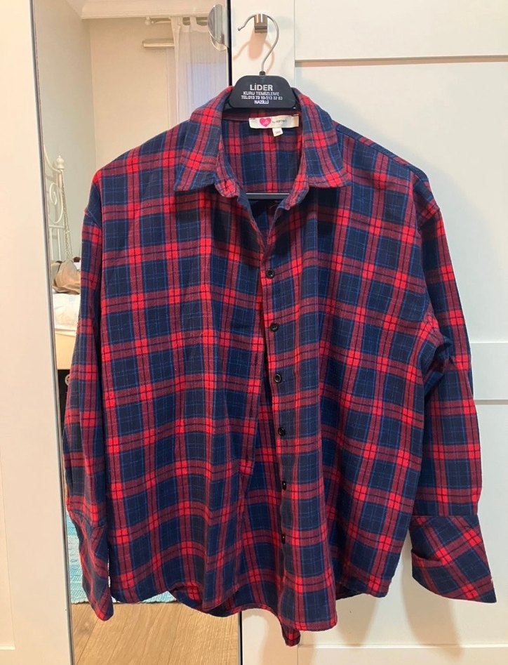 Uzun kollu, düğmeli ve salaş kesim kadın gömlek. kırmızı-lacivert ekose desenli rahat pamuk kumaştan üretilmiştir. Az kullandım tertemiz