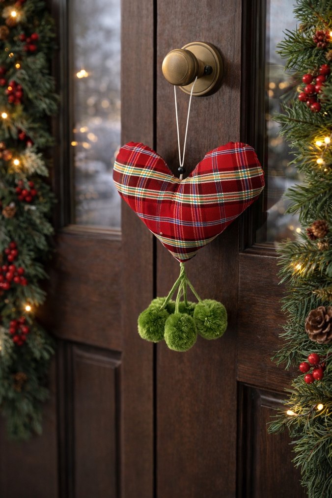 Kırmızı ekose desenli kalp şeklinde, yeşil ponponlu kapı süsü. Evinize renkli ve şık bir dokunuş katar.