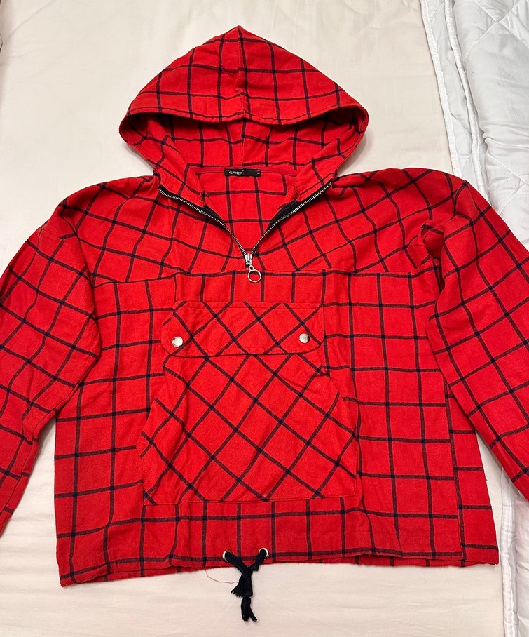 Kırmızı ekose desenli kadın ceket, kapüşonlu ve fermuarlı. Yumuşak kumaştan, bol kesim, uzun kollu ve ön cepli. Rahat kullanım için ipli etek ucu bulunur.