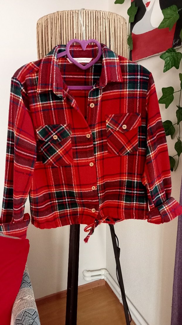 M ve L uyumlu. Bir defa giyildi. Uzun kollu, düğmeli, bol kesim kadın gömleği. Yumuşak tekstil kumaştan, renkli kırmızı ekose desenli, günlük kullanım için uygundur.