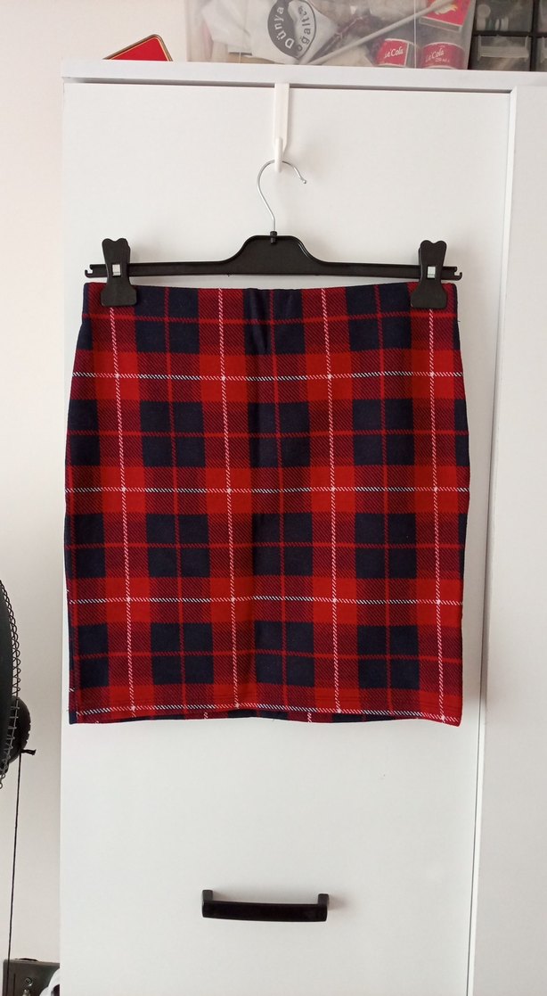 Koyu kırmızı ekose desenli, kemerli ve kalı likralı kumaştan yapılmış, normal boy midi kesim vücuda oturan kadın eteği. Sokak modasına uygun, rahat ve günlük kullanım için ideal.