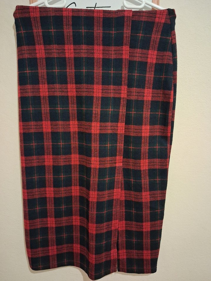Kırmızı ve koyu renkli ekose desenli, sentetik kumaştan midi uzunlukta etek. Ürünün arkasında üretimden kaynaklı dokuma hatası vardır fakat belli olmuyor.