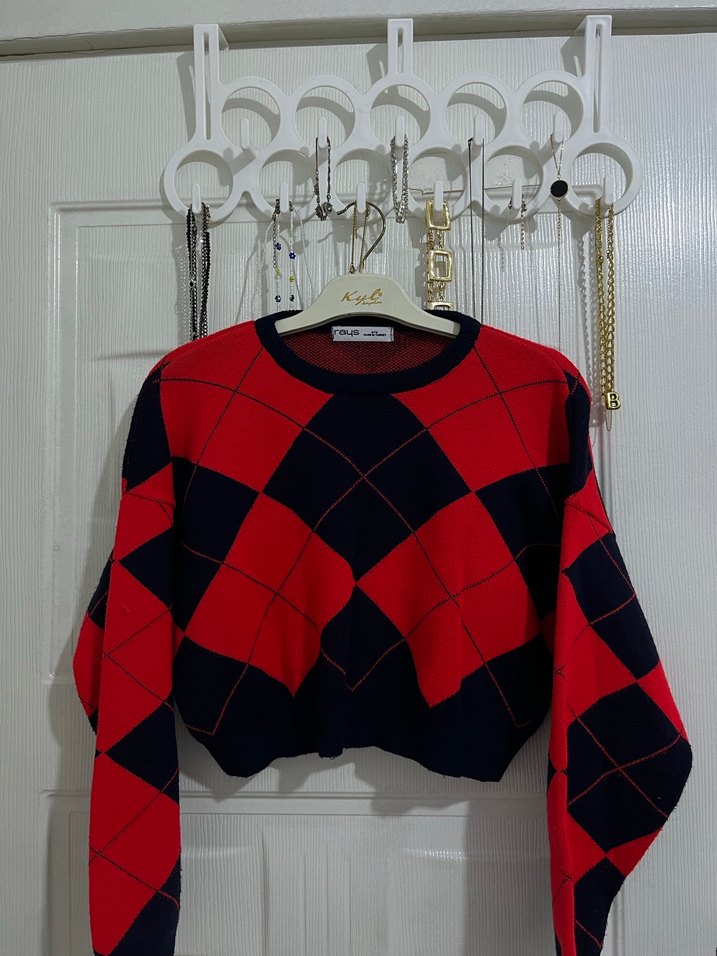 Kırmızı ve siyah ekose desenli örgü kumaştan, uzun kollu, yuvarlak yakalı, rahat kesim kısa uzunlukta kadın kazak.
