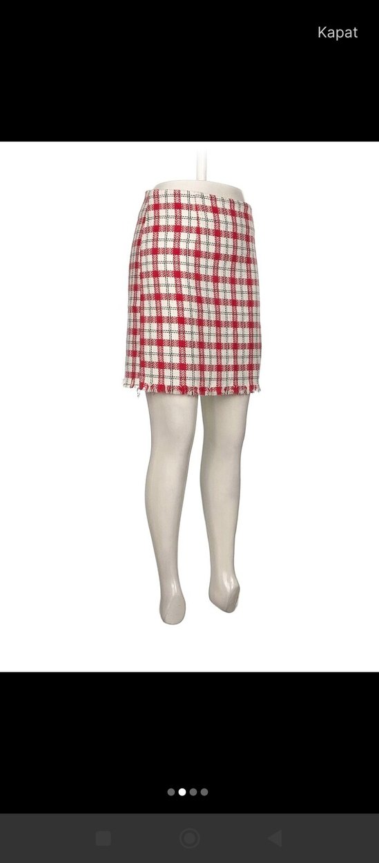 Kırmızı ve beyaz ekose desenli, pilili ve vücuda oturan midi etek. Sentetik kumaştan ve günlük kullanıma uygun açık kırmızı tonda.