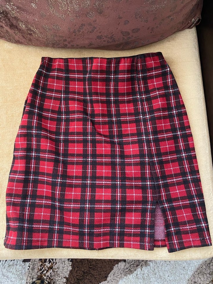 Koyu kırmızı ekose desenli, sentetik kumaştan yapılmış, pilili ve fitted kesime sahip mini etek, dış mekan kullanımı için uygundur. Beli yapıldığı için s beden olarak düşünülebilir