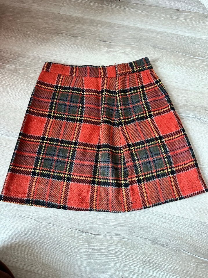 Renkli kırmızı mini etek, bol kesim ve pilili tasarıma sahip, sıcak yün kumaftan yapılmıştır. Ekose deseni, rahat ve karşı kültür havası verir, dış mekan için uygundur.