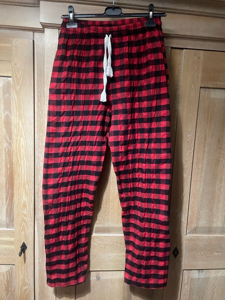 Koyu kırmızı ekose desenli, bağcıklı bel detaylı, bol kesim pijama altı. Rahat ve gündelik tarz için uygundur. Bel lastikli yandan cepli bel ölçüsü 70 santim esneme payı var boy 100 santim