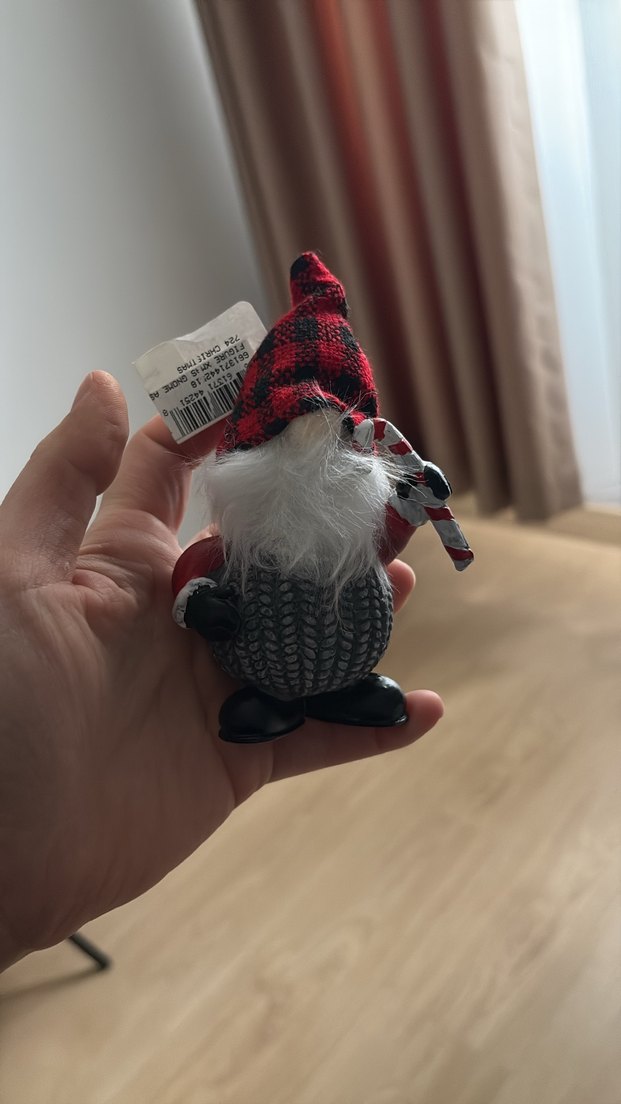 Kırmızı ekose şapkalı, beyaz sakallı ve şeker kamışı tutan gri cüce figür, detaylı örgü desenli kıyafetlere sahip.