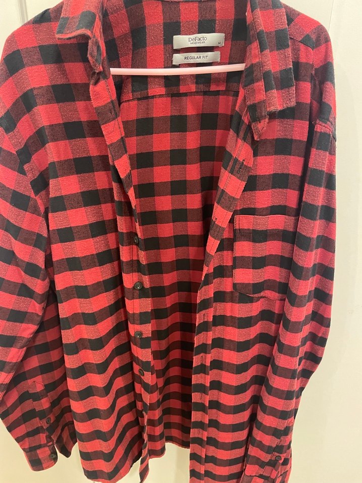 Kırmızı ekose desenli, uzun kollu, düğmeli ve notalı yakalı gömlek. Rahat kesimi ve yumuşak kumaşıyla günlük kullanıma uygundur.