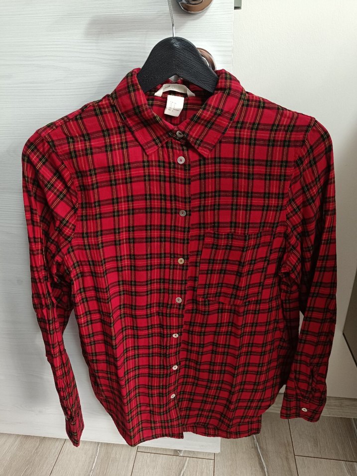 Kırmızı ekose desenli, düğmeli, uzun kollu, yakalı ve normal uzunlukta kadın gömleği. az kullanıldı deformesi yok ihtiyaç fazlası olduğu için satıyorum