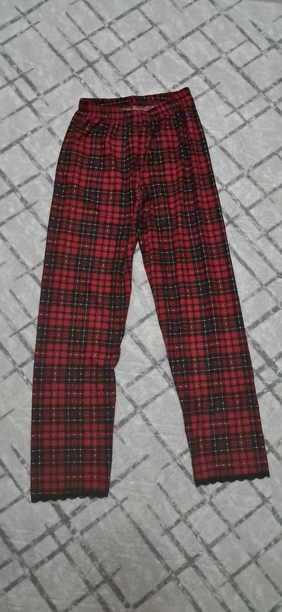 Kırmızı Ekoseli Dantel Detaylı 3 parça pijama takımı