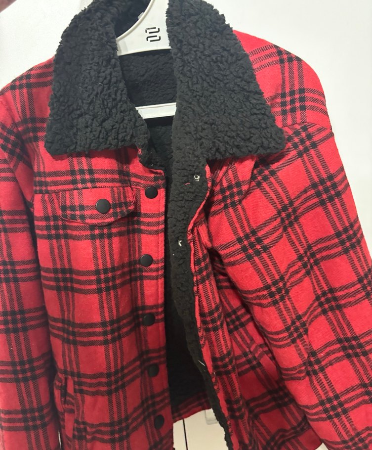 Koyu kırmızı ekoseli, düğmeli, notched lapel yakalı, uzun kollu, bol kesim kadın gömleği. Yumuşak ve sıcak kumaştan, rahat sokak stili için uygundur.