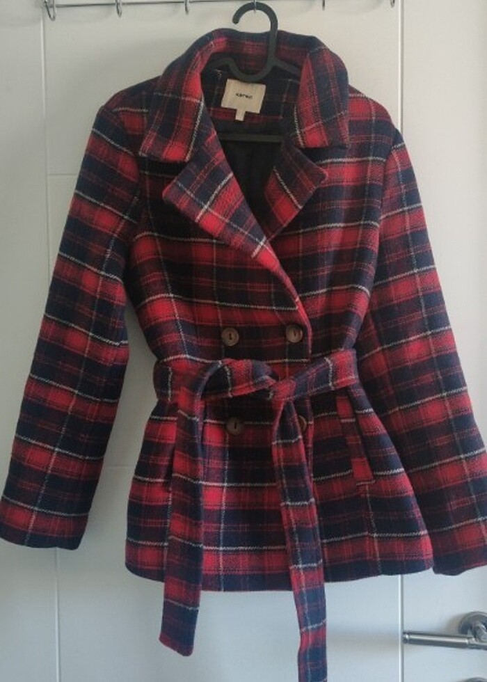 Kırmızı ekoseli kuşaklı kısa kaban
