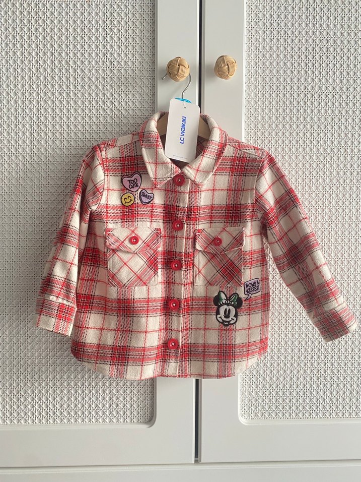 Kırmızı ekoseli, nakışlı yamalarla süslenmiş, düğmeli, uzun kollu ve rahat kesim çocuk gömleği.