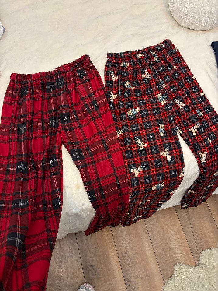 Rahat kesim ve canlı kırmızı ekoseli desenlerle evde konforlu kullanım için pijama altları.Ayıcıklı olan M beden diğeri Xxl beden.Tam çiftler için.Kumaşı kadifedir