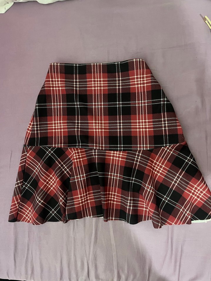 , kırmızı ve siyah ekoseli, pilili, dar kesim mini etek. Sokak modası ve grunge punk tarzını yansıtır, günlük kullanıma uygundur.