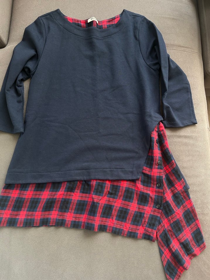 Salaş kesim, uzun kollu ve bisiklet yaka Koyu renk üst kısmı, kırmızı ekoseli kumaşla katmanlıdır. Günlük kullanıma uygundur.