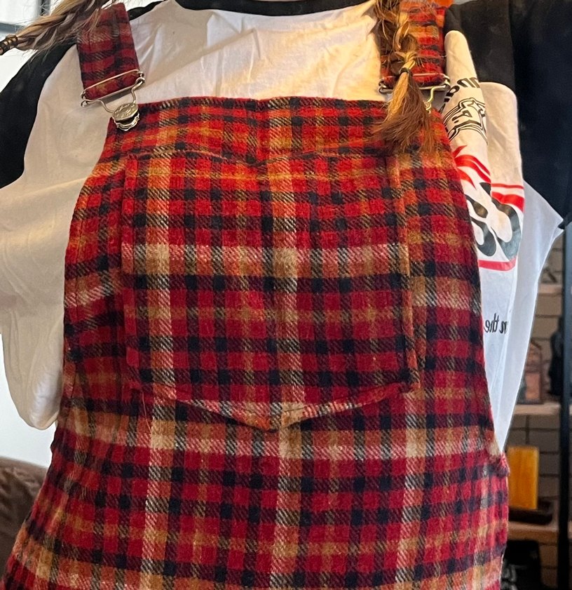 Koyu kırmızı ekoseli, ön cepli ve ayarlanabilir askılı etekli salopet.