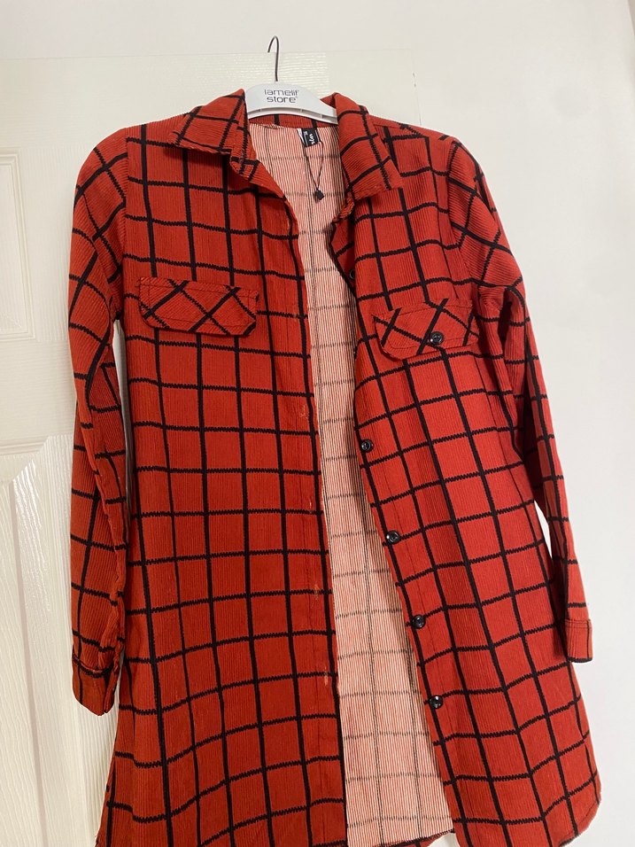 Koyu kırmızı ekoseli, uzun kollu, düğmeli, bol kesim kadın gömlek. Notlu yaka ve uzun boyuyla rahat, sokak stiline uygun.