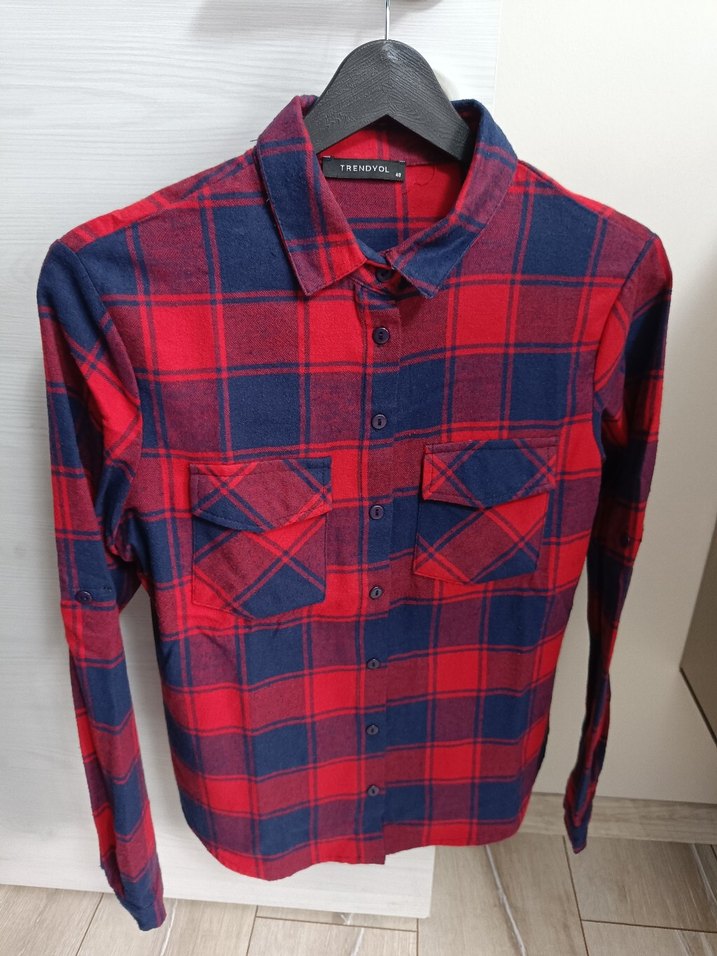 Kadın gömlek, kırmızı ve koyu mavi ekoseli desende, düğmeli ve uzun kolludur. az kullanıldı deformesi yok .
