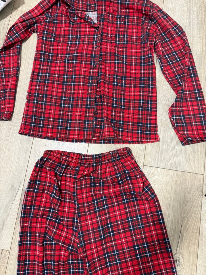 Koyu kırmızı ekoseli, uzun kollu, regular fit kadın pijama takımı. Düğmeli üst ve lastikli bel pantolon rahatlık sağlar. hiç kullanılmamıştur alt üst takım