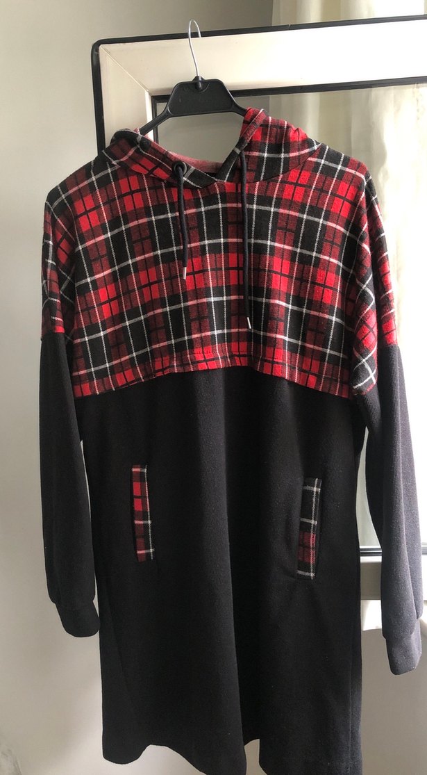 Üst kısmı kırmızı ekoseli, alt kısmı siyah uzun kollu kapüşonlu hafif kalın kumaş tunik günlük kullanıma uygun rahat ve konforlu.