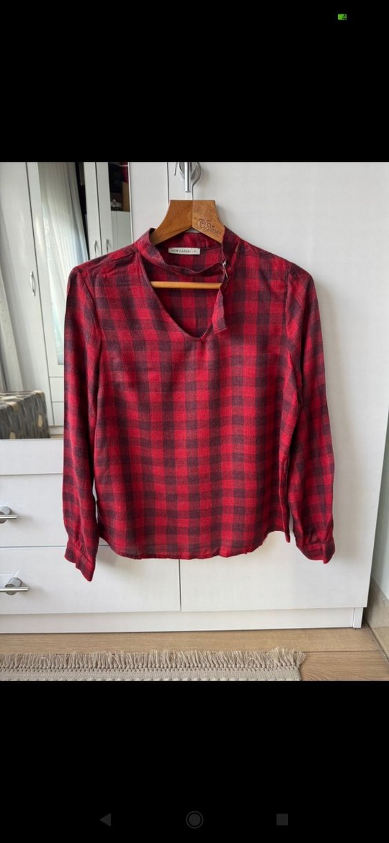 Koyu kırmızı ekoseli, düğmelisiz detaylı, V yaka, uzun kollu, bol kesim kadın gömleği. Yumuşak sentetik kumaştan, midi boyda ve rahat kesimdir.