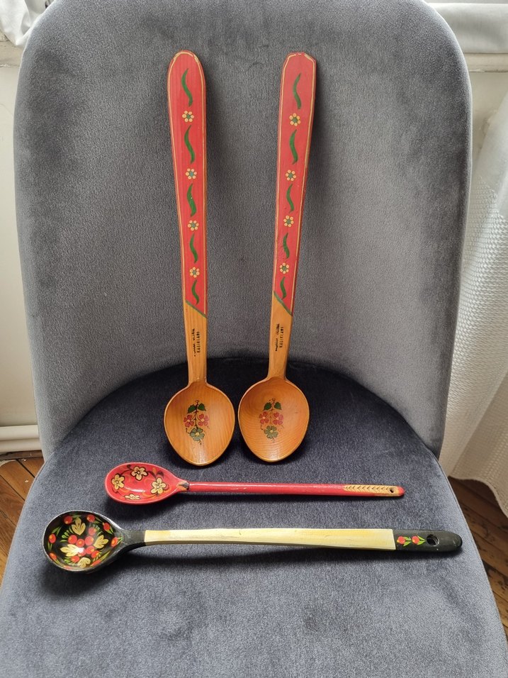 Koyu kırmızı renkte, el boyaması çiçek desenli uzun saplı ahşap kaşık seti.