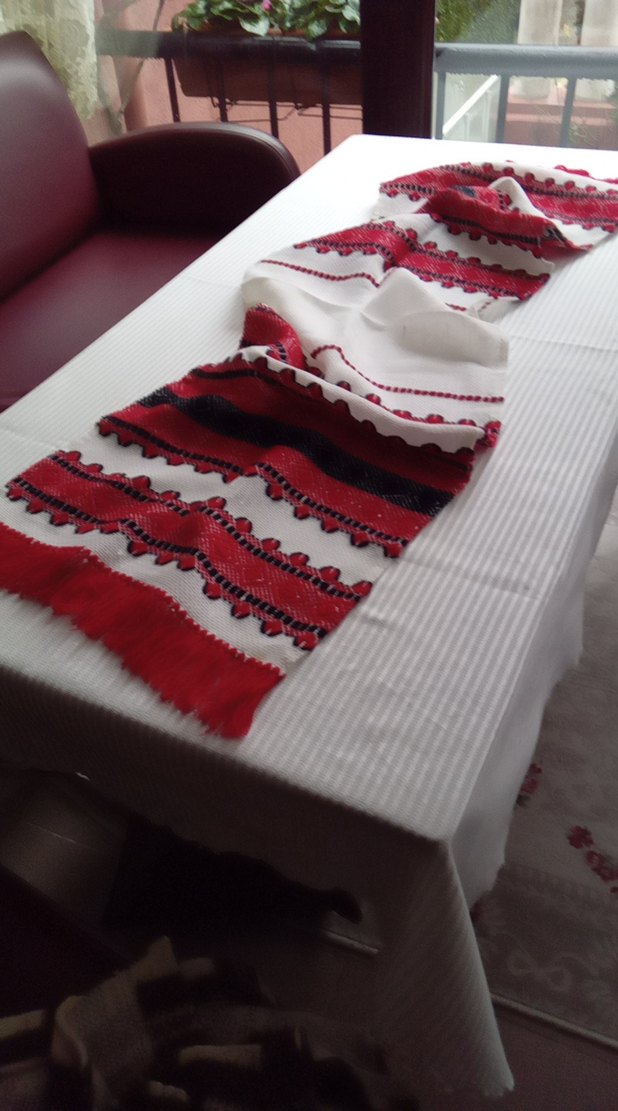 Renkli kırmızı desenli tamamı elde işlenmiş çok amaçlı örtü..ranir..Romanya dan hediye gelmişti, hiç kullanılmadı dolabımda bekledi. seyrek keten üstüne pamuk iple işlenmiş. 135×45cm.